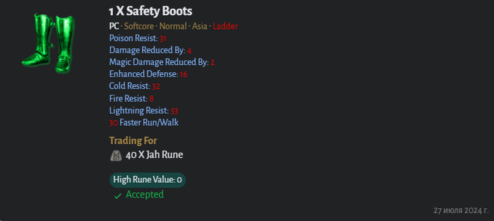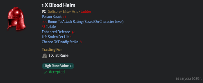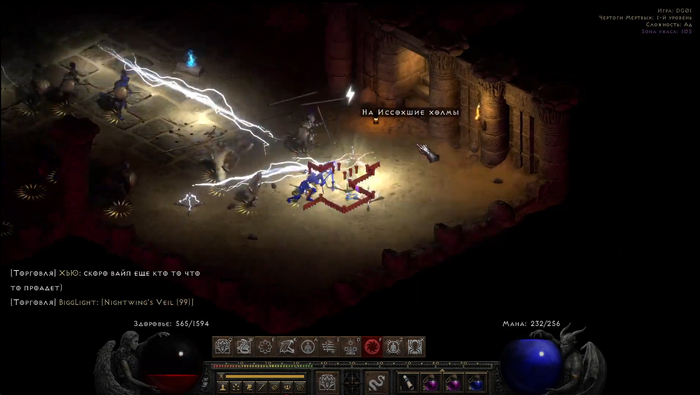 Броню я использовал Hustle, на которой конечно нет скиллов как на Treachery, но есть скорость бега и амазонские уклонялки, к тому же Fade 28 уровня не будет сбиваться. Щит использовал сначала Rhime затем Spirit. На голове сначала была тиара +2 скилла, затем сварил Fickering Flame, Dragon Tail это огненный скилл, так что шлем дает +3 к нему и пробитие реза к огню. В качестве оружия со второго акта нормы до первых квестов хелла был скимитар с рунным словом Steel, затем появились когти Bartuc's Cut-Throat, потом сварил меч Lowbringer, самое главное на котором это шанс на каст проклятия Decrepify снимающего физ иммунитет и усиливающего урон в полтора раза, как позже выяснилось его на сервере можно собрать в когтях, как и Crescent Moon.