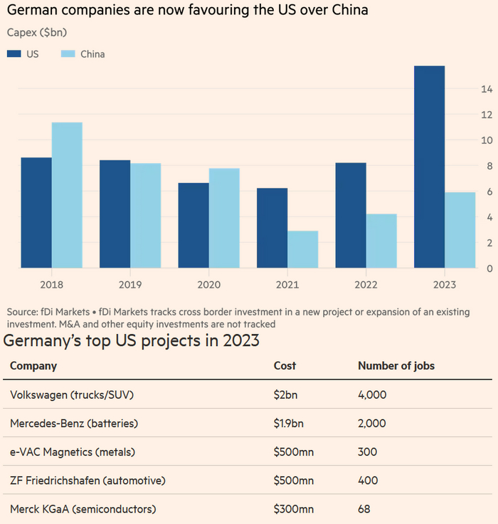 Немецкие компании объявили о рекордных капитальных инвестициях в размере 15,7 млрд долларов в проектах в США в прошлом году, по сравнению с 8,2 млрд долларов годом ранее, согласно данным, собранным fDi Markets, дочерней компанией Financial Times.