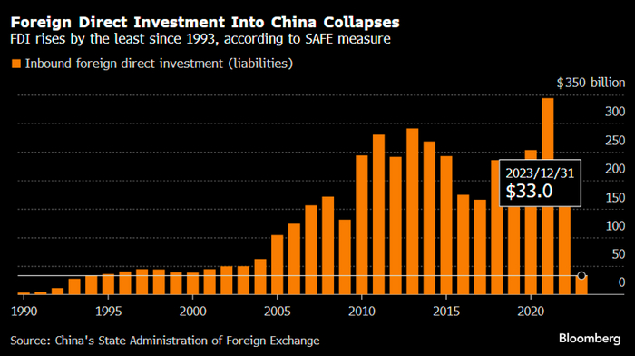 А вот прямые иностранные инвестиции в Китай в прошлом году рухнули. Если в 2022 иностранные компании вложились в Китай суммой 180,2 млрд $, то в прошлом всего 33 млрд $. Провал? Еще какой! Самый низкий уровень с 1993 года.