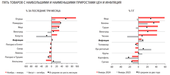Справа: январь 2024 (красное) и январь 2023 (серое) изменение к аналогичному периоду годом ранее.