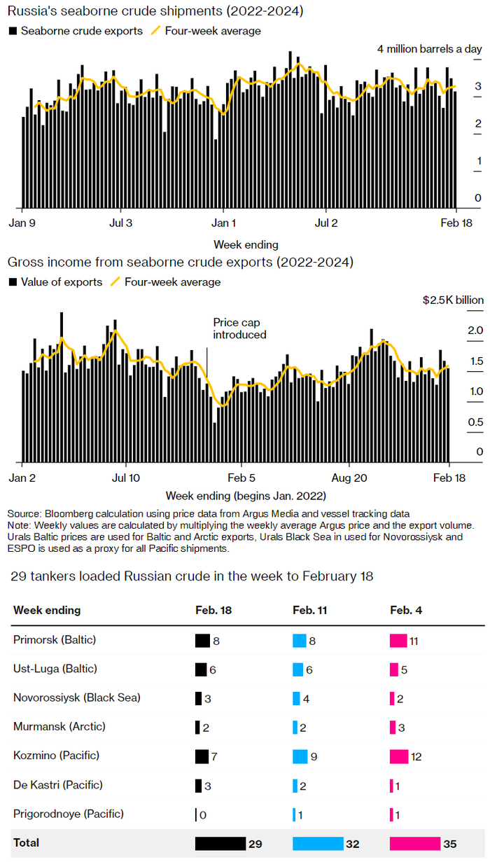 Ну так и. Что там с нефтью? За прошлую неделю морские поставки нашей нефти сократились до 3,13 млн.баррелей в сутки. И всё это занесло в кубышку, спонсирующую нашу с вами военную машину, 1,55 млрд $.