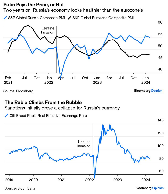 Таким вопросом задаётся чистопородное независимое сми Bloomberg. Два года беспрецедентного всемирного давления за плечами, а российская экономика выглядит здоровее, чем экономика Еврозоны. «Вот это поворот!» (с)