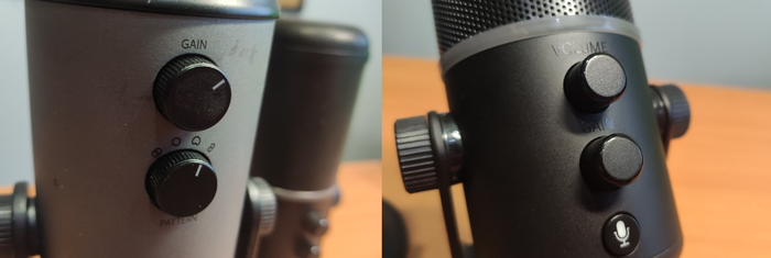 Все регуляторы у микрофонов вынесены на корпус сбоку. У Yeti это вкл/выкл, громкость, чувствительность и переключение режимов. Из плюсов - четко видно, что где и на каком уровне выставлено. Ребристость корпуса переключателей и тугость хода позволяют понимать, что и как ты делаешь. Однако кнопки у Yeti разнесены по разным сторонам и постоянно приходится лезть головой смотреть “что там как там”, если надо поменять что-то, либо крутить микрофоном туда-сюда.
