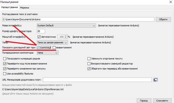 - в настройках ардуино ИДЕ ставим галочку в пункте "Компиляция"
