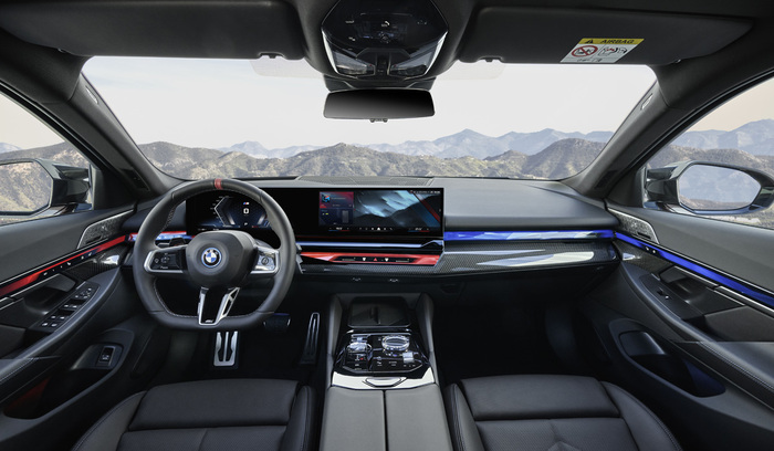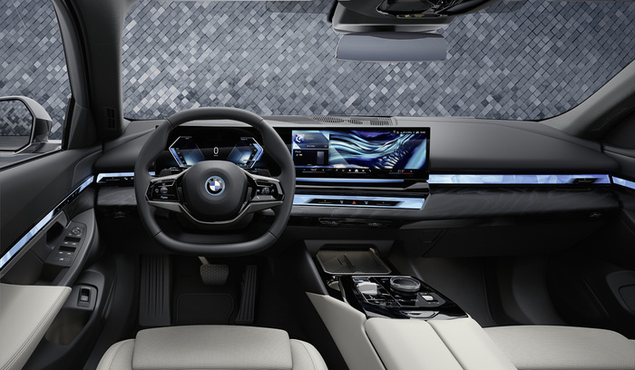 По оформлению интерьера «пятерка» идет стопами семерки количество кнопок и рукояток сокращено, изогнутая панель вмещает приборный экран диагональю 12,3 дюйма и мультимедийный тачскрин на 14,9 дюйма. Сенсорные клавиши на руле и под экраном снабжены виброотдачей. Управление климат-контролем интегрировано в медиасистему, а для регулировки скрытых дефлекторов вентиляции установлены отдельные джойстики в нижней части передней панели.
