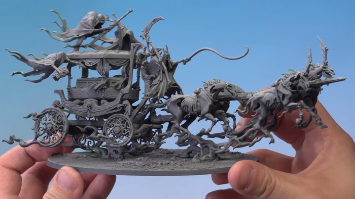 Подобную технику можно использовать на миниатюрах самого разного размера. Например, вот так она выглядит на модели Чёрной Кареты. На полный покрас летящего призрачного экипажа ушло примерно сорок минут