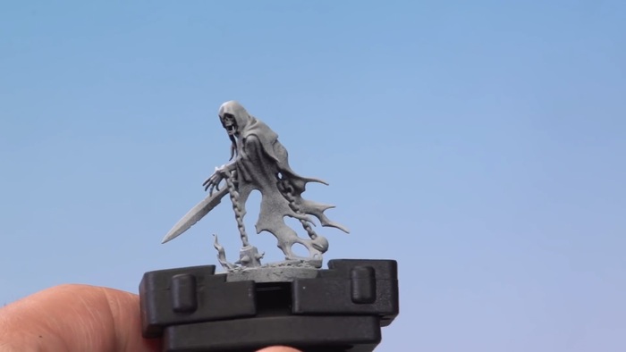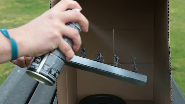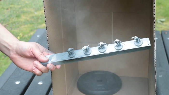 На этот раз направление струи должно быть строго вертикальное, сверху вниз - а время грунтования небольшим, чтобы модели получили более тонкий слой грунта, под которым будут проступать предыдущие слои