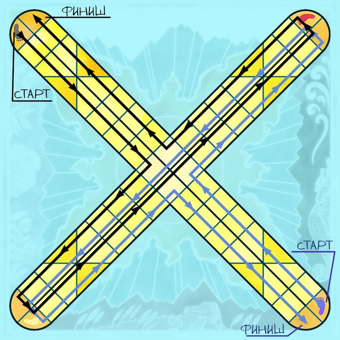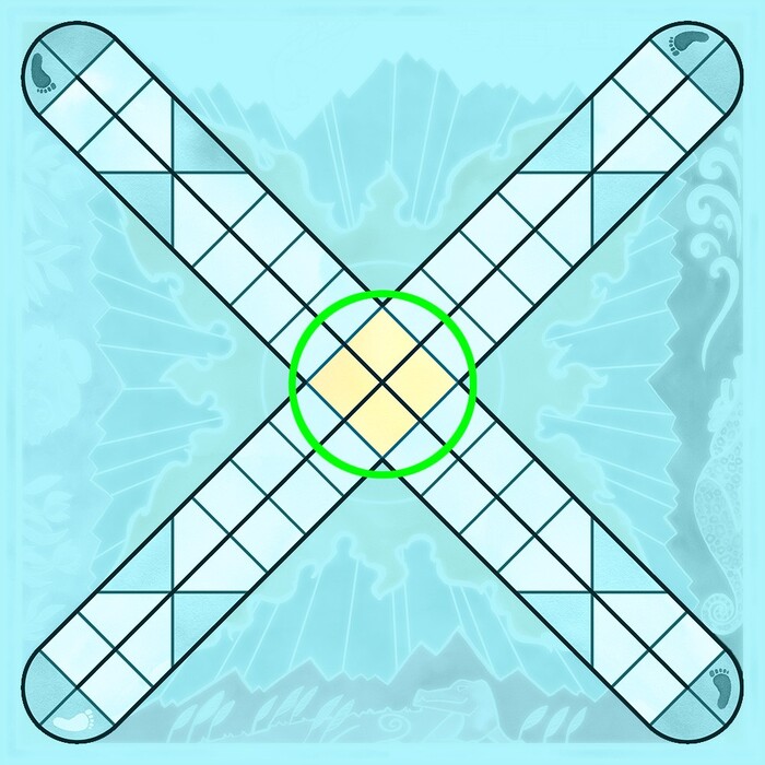 Если фишка попадает в полукруглую зону в конце сторон креста (тоже восемь), игрок делает второй ход.