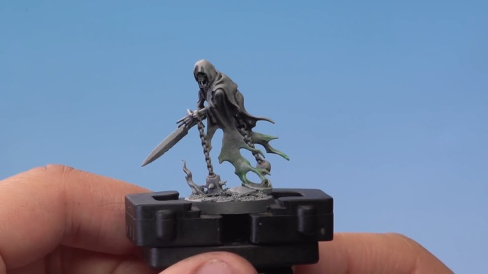 Зелёный Контраст Hexwraith Flame придаст Скрежетальщикам немного живости. Эта краска довольно прозрачная, плавные переходы получаются легко. Прозрачность можно усилить, добавив каплю медиума. Аккуратно подкрасим края плаща и глазницы модели. Края плащей красим движениями от краёв внутрь, чтобы к завершению мазка наносимый слой становился почти невидимым