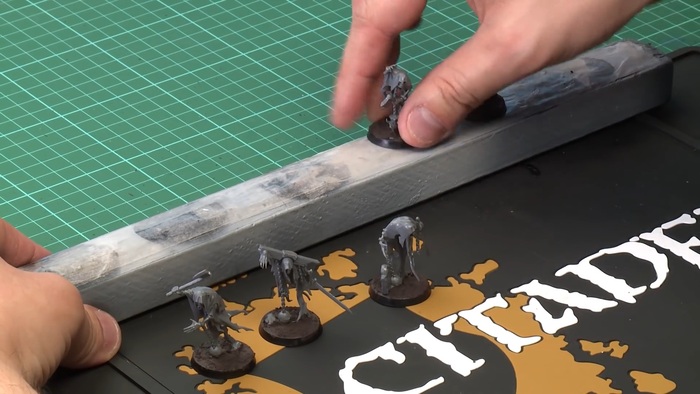 На предварительном этапе нанесём на подставки бурую текстурную краску Stirland Battlemire. Последующие этапы повлияют на подставки точно также, как и на сами миниатюры