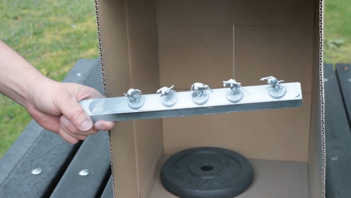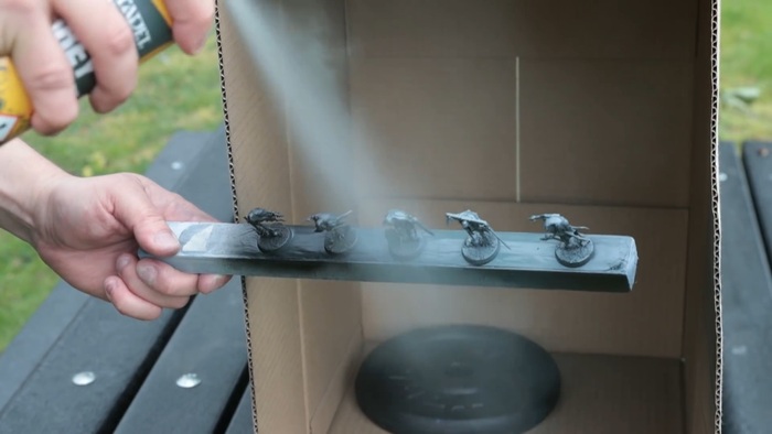 Один из удобных способов грунтования сразу нескольких моделей - использование специальной (или самой обычной) палки с наклеенной на неё лентой двухстороннего скотча. Одной стороной скотч прилипает к палке, на вторую ставим миниатюры