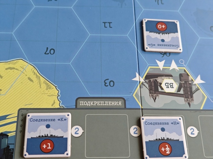 В начале партии у игрока за Британию два торговых судна на поле. Их может быть и больше, но если их станет меньше двух, он добирает жетон (или жетоны) судна из мешочка. Также британец получает один жетон соединения и выкладывает на поле. Остальные два располагаются на шкале подкрепления. Соединения ему понадобятся, чтобы искать главный корабль Германии.