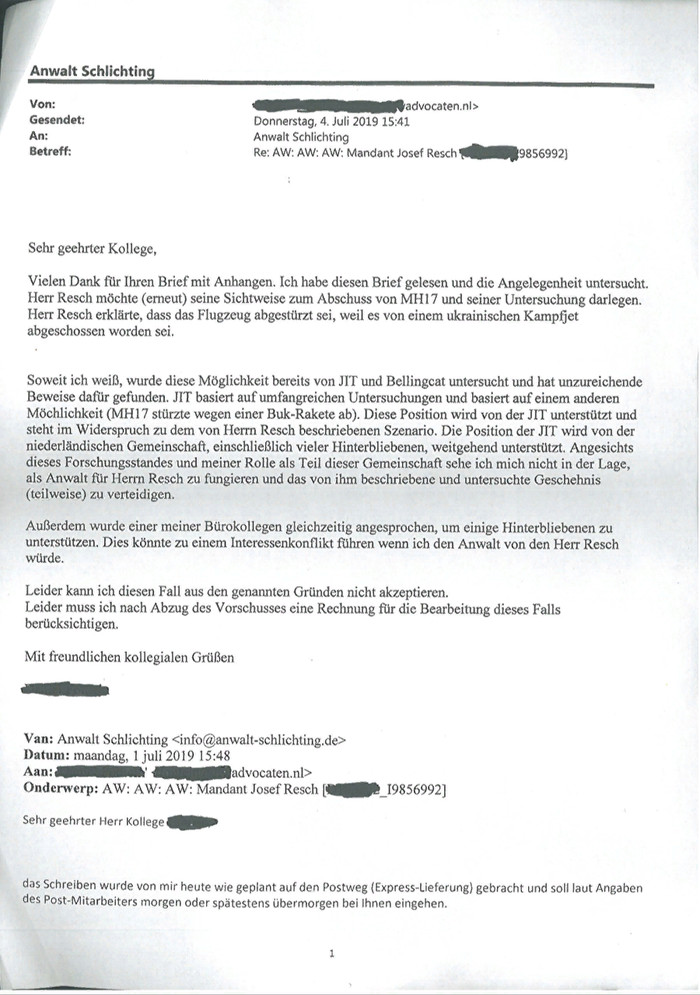 Голландский адвокат, которого детектив хотел нанять для передачи своих данных прокуратуре Нидерландов, пишет: «Я прочитал это письмо и изучил вопрос. Господин Реш хотел бы (вновь. — Прим. ред.) изложить свою точку зрения по поводу сбитого MH17 и свое расследование. Господин Реш заявил, что самолет потерпел крушение, поскольку был сбит украинским истребителем. Насколько я знаю, такую возможность уже проверяли ССГ и Bellingcat и нашли недостаточно доказательств этой версии…». На вопрос РИА Новости, может ли он подтвердить, что вел речь о том, что Boeing был сбит истребителем ВВС Украины, Реш ответил: «Абсолютно нет, это (голландский. — Прим. ред.) адвокат сам сложил из сопроводительного письма моего адвоката и моего. Возьмите на вооружение логику: если бы я сказал (голландскому. — Прим. ред.) адвокату такое, он не принял бы поручение с самого начала, а не только после того, как мой (немецкий. — Прим. ред.) адвокат отправил черновик проекта своему коллеге в Голландии».