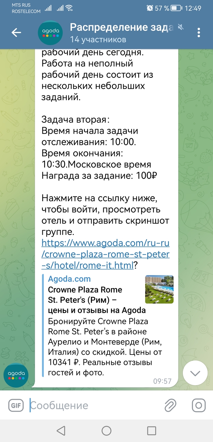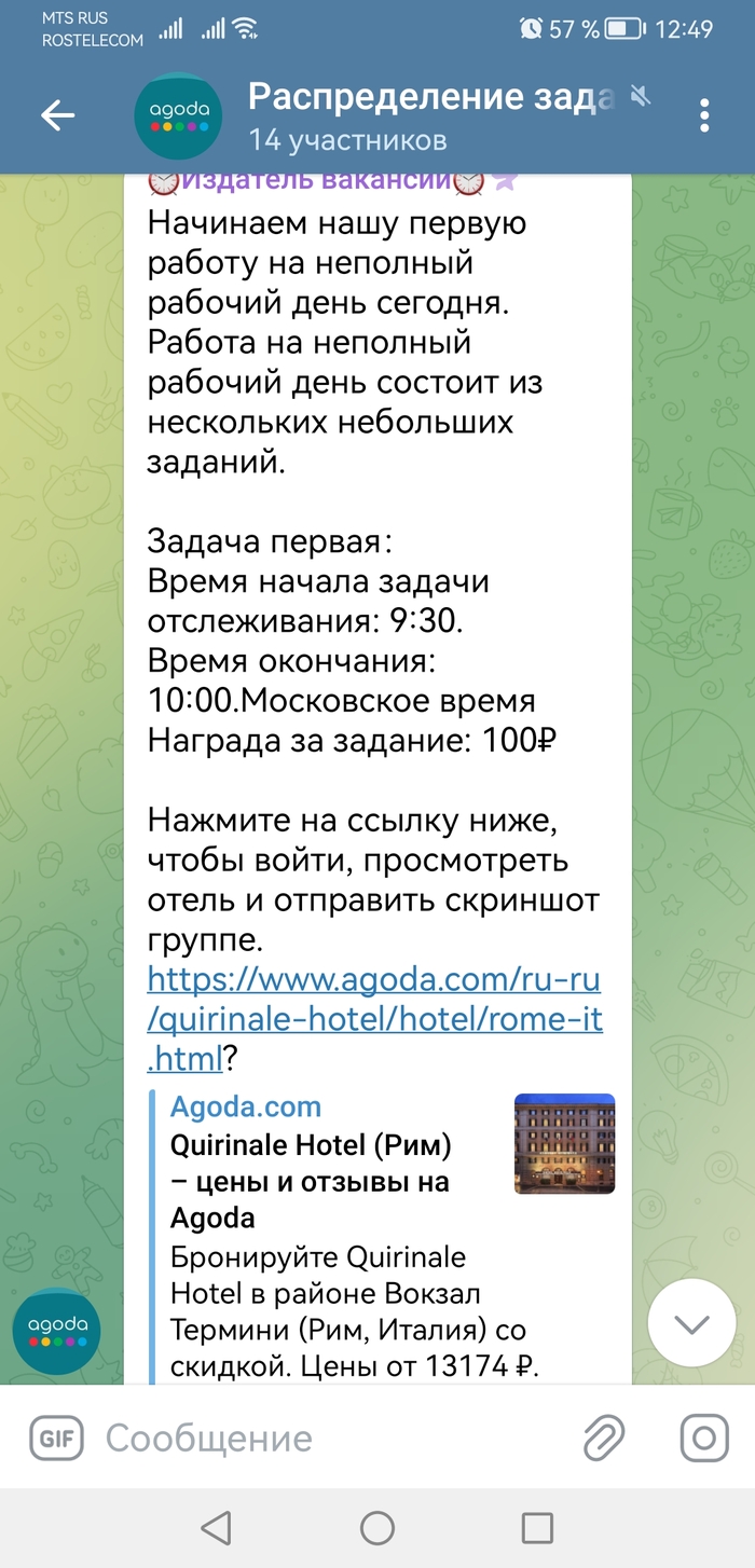 Давно вас не было слышно подумала я, и конечно перешла в телеграм. Там менеджер рассказала что работа совсем не сложная нужно переходить по ссылкам делать скрины, отправлять ей и получать денежки. Ну вот и на моей улице перевернулся грузовик с халявой (нет) подумала я, и пошла скринить отели по ссылкам😁