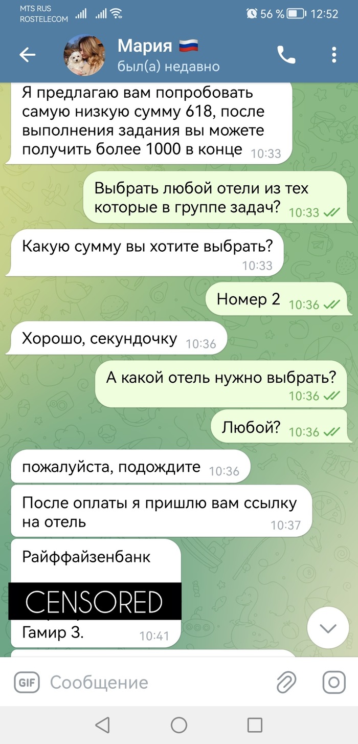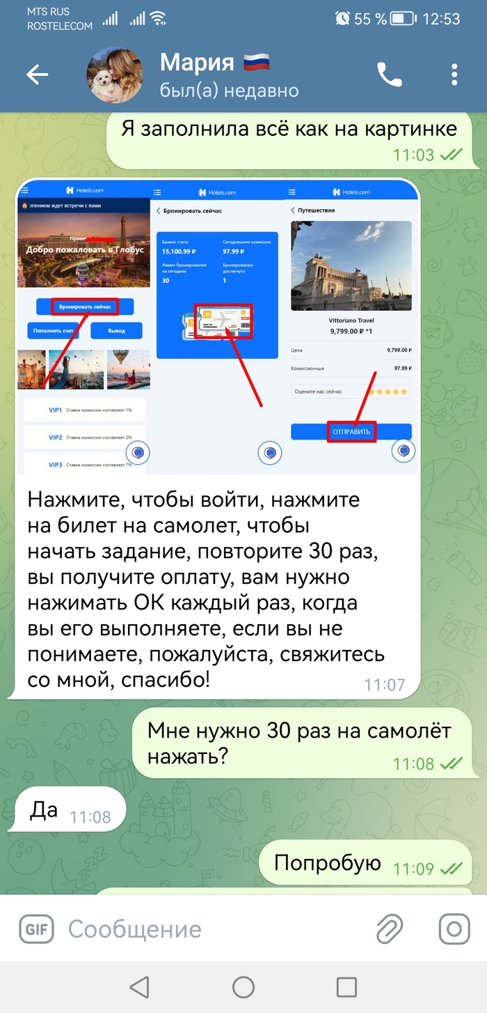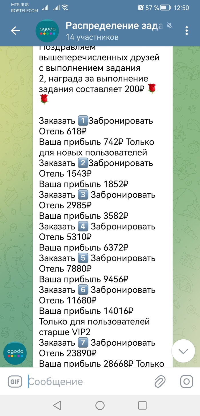 На следующий день в группе, которая состоит из одних ботов (кроме самой жертвы), начинают присылать задания. Первые два задания сделать скрины отелей и прислать в "рабочую группу". Третье задания отличается от первых двух. В третьем задании нужно бронировать отели, тем самым повышая рейтинг их, а добрые владельцы гостиниц будут тебе платить за это процент (нет) . Суммы разные на выбор.