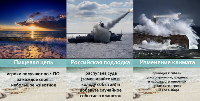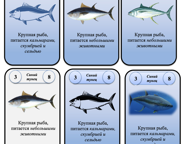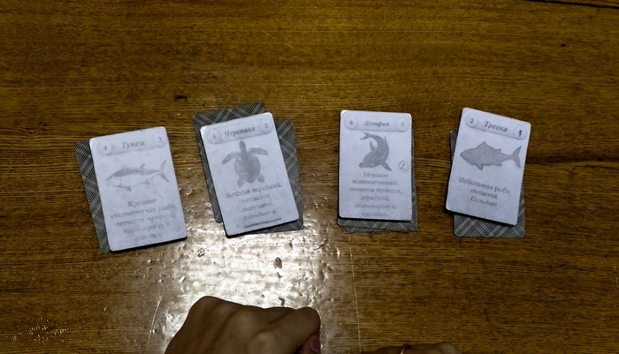 С рабочим вариантом помог Максим Николюкин, подобрав множество фотографий рыб (и животных) и наложив их на подводный фон — а я немного скорректировал дизайн, напечатал и нарезал. Прототип получился шикарным — с лёгким налётом "Сабнавтики" и манящими морскими глубинами. Андрей был недоволен: негоже китам плавать над песочком! Но игрокам очень нравилось. Разложенная на столе "Селёдка" представлялась им огромным океаном.