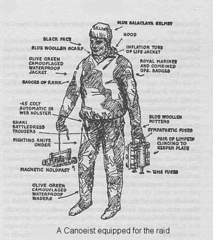 Каждая байдарка должна была нести на себе восемь магнитных мин, ключ для активации мины три комплекта весел, компас, глубинометр, ремонтный мешок, фонарик, камуфляжные сети, одонепроницаемые часы, лески, две ручные гранаты, продовольствие и воду из расчета на шесть дней. Каждый морпех получал пистолет-пулемет STEN Mkl, 11,43-мм автоматический пистолет Colt M1911 A1 и нож коммандос Fairbairne & Sykes.