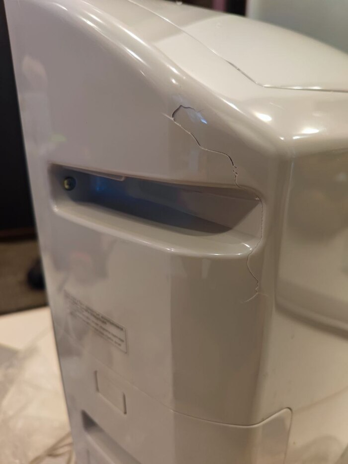 Я пришел довольный домой, поставил на пол увлажнитель и снял пленку и увидел ЭТО. Обратите внимание, что при солнечном свете почему-то не так сильно видно, как при желтом освещении.