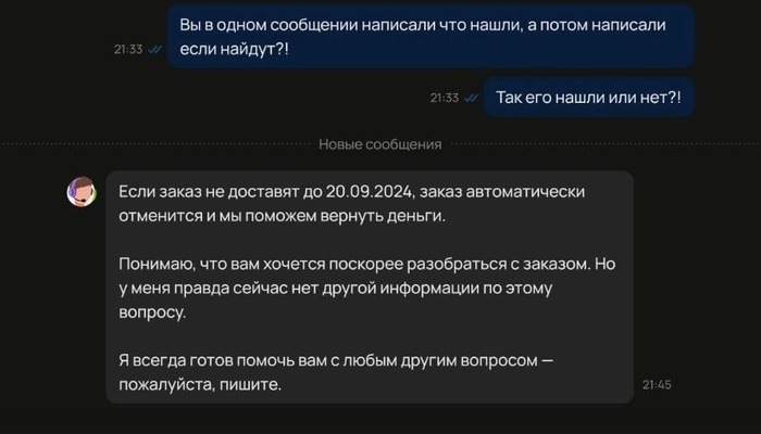 Продавцу на Авито вообще ответили , что заказ типа найден и будет доставлен до 20 числа .