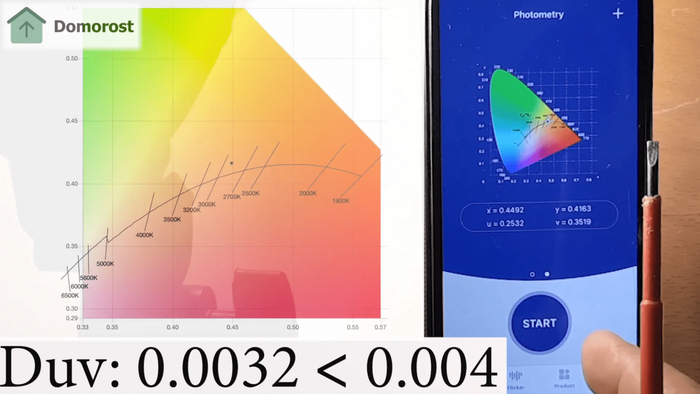 Давайте посмотрим теперь на эту лампочку с точки зрения качества света. Гаусс обещает цветовую температуру 4100 К. По факту же получилось 3943 К. Коэффициент цветопередачи был заявлен более 90, а по факту — 80.