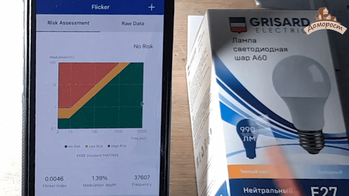 Также Гаусс утверждает, что у этой лампы отсутствуют пульсации, давайте убедимся в этом сами! Пульсации оказались равными 1.32%. С точки зрения стандартов все хорошо, пульсации ниже 5%, но все же я ожидаю от лидера отрасли лучшего результата, т.е пульсаций менее 1%.