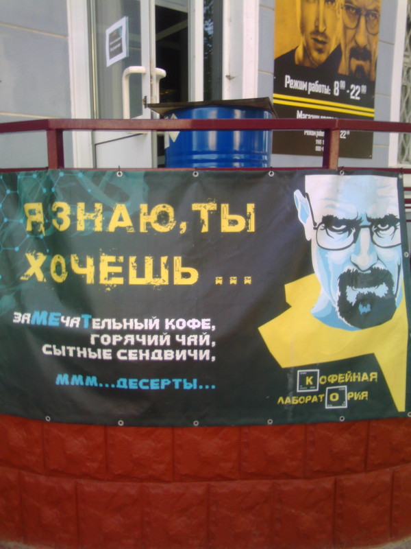 Обустроить небольшое помещение (45 «квадратов») создатели новой кофейни решили в духе популярной и номинированной на все возможные премии американской криминальной драмы «Во все тяжкие». Правда, по понятным причинам сходство заканчивается только на антураже и обстановке — никаких совпадений в меню и реагентах.
