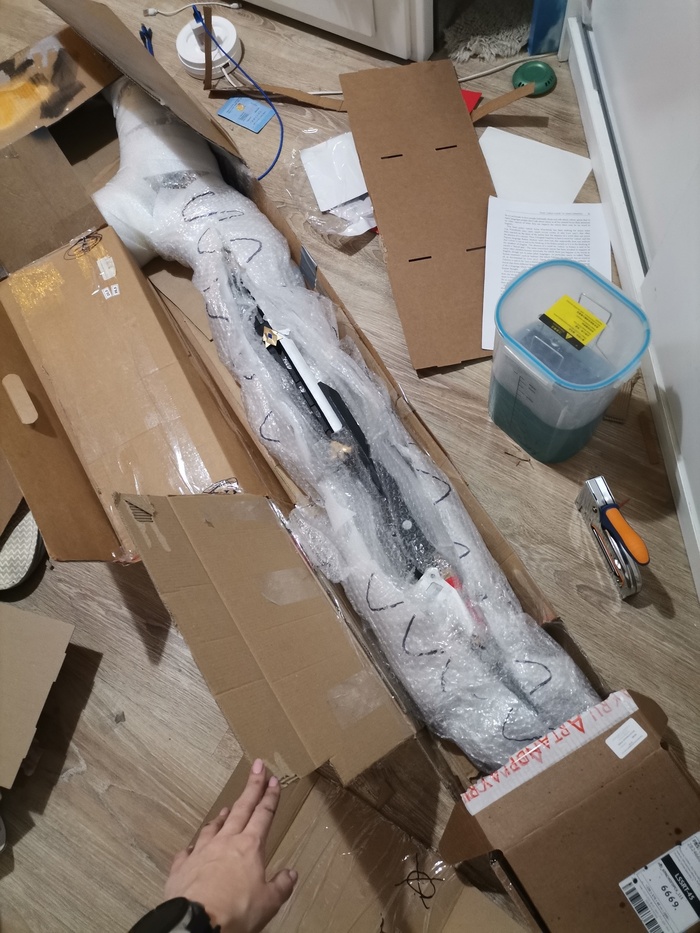 Сама девушка находится в Москве и потому пушку мы решили пересылать СДЭКом. На минуточку готовый крафт составил 170см длинны. Вот так это было упаковано в миллион пупырки и коробок, чтобы доехало точно надежно. За упаковку я заплатила еще 1000 рублей