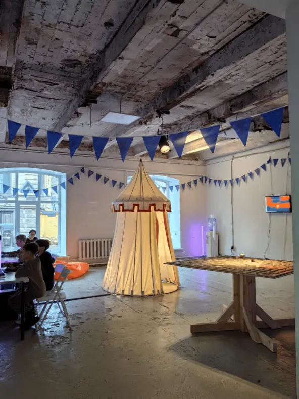 На улице к помещению выставки ведут зелёные стрелочки, которыми герои прокладывают свой маршрут в игре. А на входной двери тёмное звёздное небо — геройский «туман войны». Уже здесь видно, как старательно организаторы подошли к оформлению.