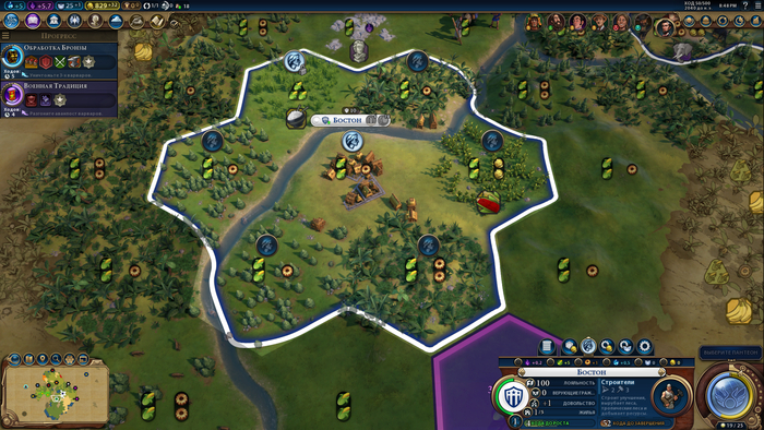 Сейчас это лишь скромное поселение. Жители первое время добывали пищу и материалы в тропическом лесу возле возле поселения, но @Hliabi.nebesnye, опытный строитель и управленец, быстро понял: тропические заросли не дадут городу развиться в полную силу. Он принял волевое решение — перевести людей на другой берег Колорадо, где среди диких зарослей зреет рис. Большое количество пиши пищи обеспечит быстрый рост населения и даст Бостону шанс стать достойным братом Вашингтона.