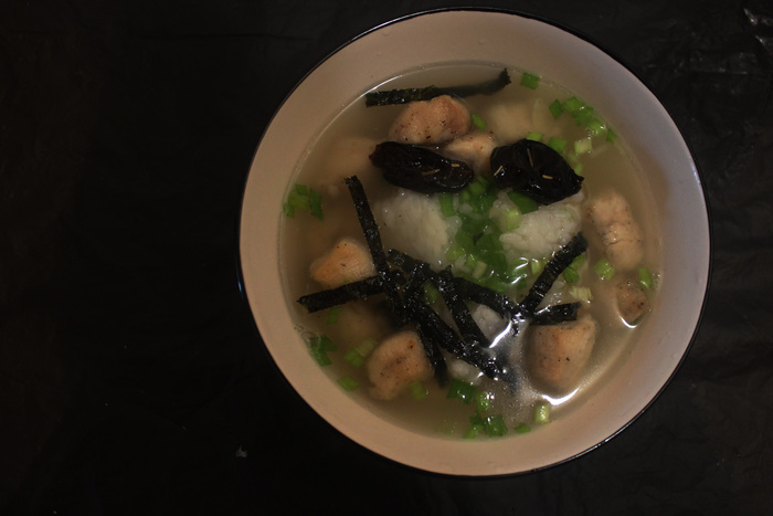 "Одна тарелка риса... Маринованные сливы и водоросли... Кусочки курицы, оставшиеся со вчерашнего ужина... Всё это плавает в кипятке. Всё это было так вкусно..."