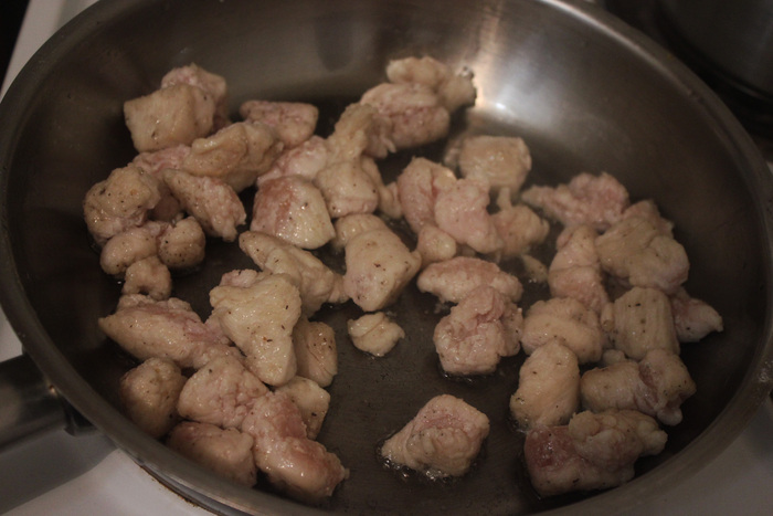 2) Пока рис варится, нарезаем куриное филе на средние кусочки. Затем, обваливаем их в смеси соли, перца и крахмала. При обвалке, стоит приложить усилий, чтобы специи плотнее сцепились с филе.