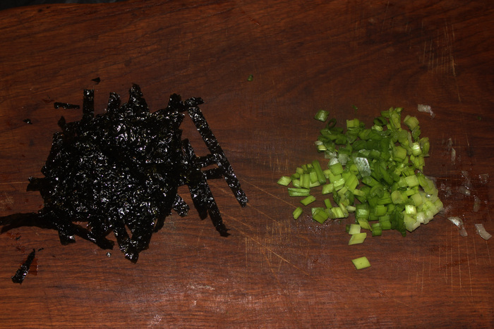 4) Пока у нас всё парится, варится, жарится - нарезаем нори на тоненькие небольшие полосочки. А затем и небольшое количество зеленого лука.