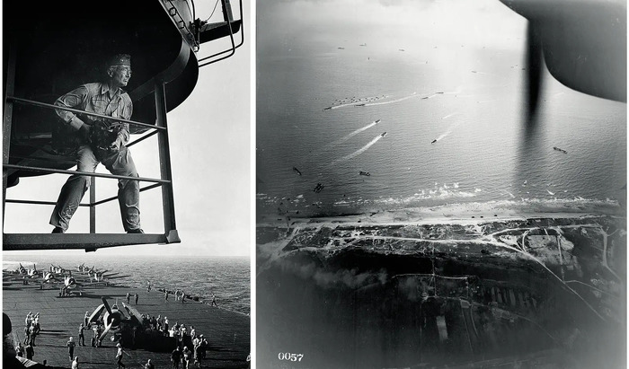Слева: фотограф Виктор Йоргенсен: капитан Эдвард Стейхен над палубой военного корабля США Лексингтон, 1943 год. Справа: фотограф неизвестен, высадка в «день Д» на пляже Юта, Нормандия, Франция, 1944 год.