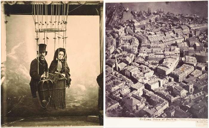 Слева: Надар с женой Эрнестин, имитирующей полет на воздушном шаре в своей парижской студии, 1865 год. Справа: Джеймс Уоллес Блэк, Как видят Бостон орлы и дикие гуси, 1860 год.
