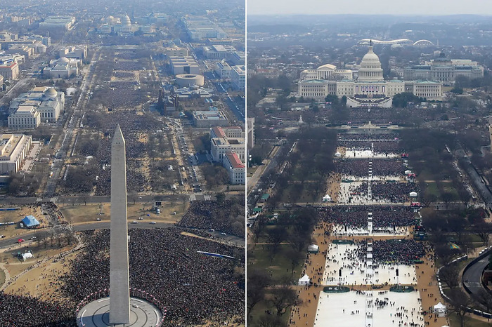 Слева: неизвестный фотограф, Инаугурация Барака Обамы, 2009 год. Справа: неизвестный фотограф, Инаугурация Дональда Трампа, 2017.