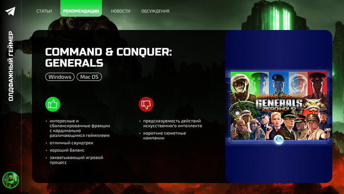 Даже спустя два десятилетия Command & Conquer: Generals остаётся отличной стратегией за счёт интересных тактических возможностей, разнообразного геймплея и хорошего игрового баланса. Несмотря на годы, проект продолжает притягивать ветеранов серии, благодаря чему мультиплеерные партии между игроками не прекращаются и по сей день! К «Генералам» можно относиться по-разному, и наверняка найдется тот, кто посчитает её устаревшей и недостойной внимания современного геймера, но в чём я точно уверен, так это в том, что она может по-настоящему увлечь даже спустя более чем два десятилетия! Поэтому могу лишь посоветовать вам окунуться в её воды и хорошенько поностальгировать, благо с современной модификацией это сделать как никогда просто и удобно!