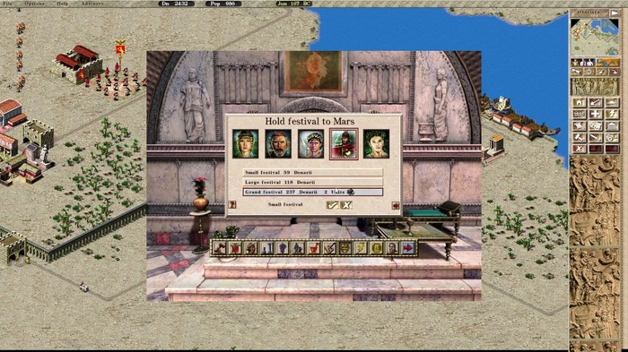 Одной из проблем граждан древнего Рима это вера в многочисленных богов. Марс (Бог войны), Венера (Богиня любви), Меркурий (Бог торговли), Церера (Богиня сельского хозяйства) и Нептун(«Бог моря»). В отличии от желания ваших жителей которые вы могли бы проигнорировать, то желания богов которые говорят вам построить тот или иной храм проигнорировать сложно, каждый из богов при выполнения условий будет давать вам Благословение в той или иной сфере за которую они собственно и отвечают.