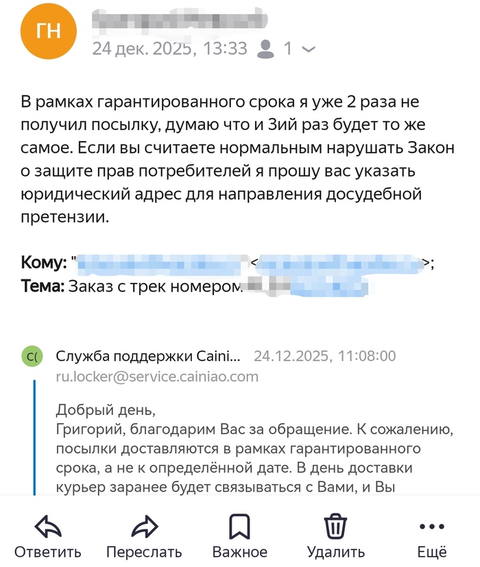Для лиги лени: служба доставки Cainiao уже месяц держит посылку на складе в Москве, вчера наконец ответили, что не доставляют по моему адресу, при переборе оказалось, что ни один адрес по территории Москвы не подходит, подошёл только в Бутово. При этом другие посылки они же на мой адрес привозят. Что делать в такой ситуации? Надеюсь на силу Пикабу.