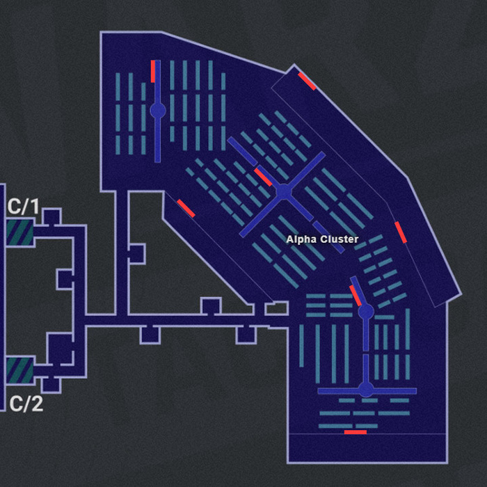 На востоке находится кластер Альфа (С1 / С2), который можно открыть, только если вставить в необходимый щиток аккумулятор и кабели