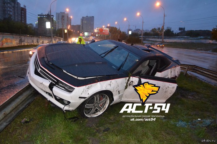Chevrolet Camaro не справился с управлением и вылетев с дороги врезался в отбойник и столб.