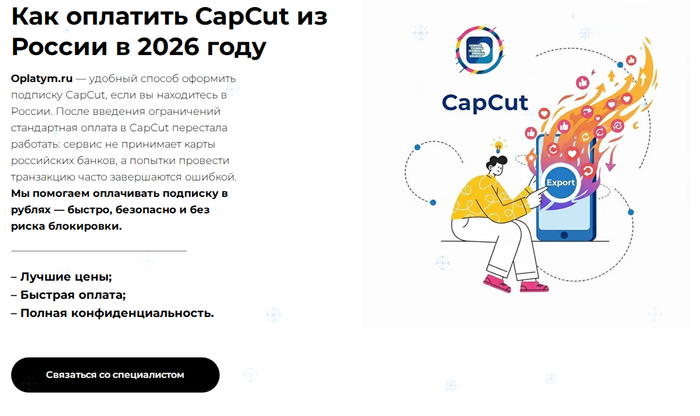 Oplatym — подходит, когда важна предсказуемость и поддержка. Оплата в рублях, понятная сумма заранее, менеджер сопровождает процесс. Купить подписку CapCut Pro через этот сервис проще всего тем, кто не хочет разбираться с платёжными инструментами самостоятельно и ищет простой ответ на вопрос как оплатить CapCut из России.