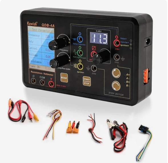 Универсальный тестер Kawish QDB-4A предназначен для диагностики и проверки множества автомобильных систем, включая катушки зажигания, форсунки, электромагнитные клапаны и шаговые двигатели.