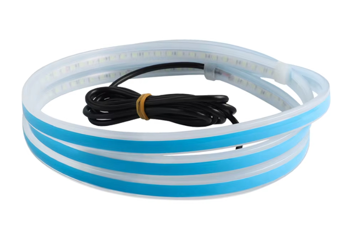 Светодиодная лента для капота не только украшает машину, но и делает её заметнее на дороге. Устройство выполняет роль дневных ходовых огней и может работать в разных режимах — от статичного свечения до мигания при включении поворотников.