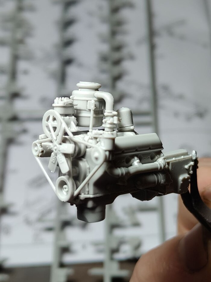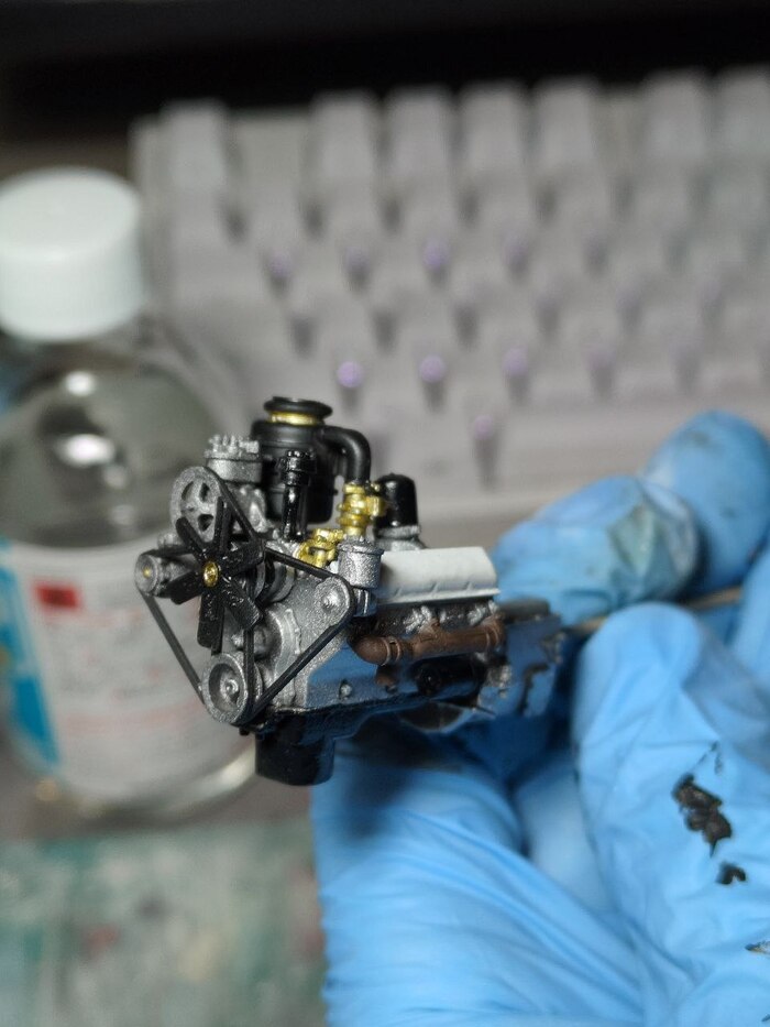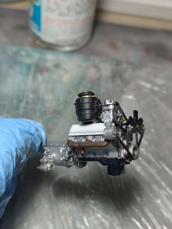 Как обычно начал с мотора. Достаточно отличная детализация. Красил металликом под серебро от MR Hobby, а после задул матовым лаком для придания эффекта алюминия