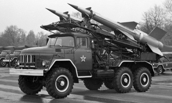 Транспортно-заряжающая машина ПР-14АМ зенитно-ракетного комплекса С-125М «Нева-М». Видны колеса с неразъемным ободом 228Г-508, внедренные с октября 1974‑го, а также повторители указателей поворотов, внедренные в декабре 1977‑го. Снимок сделан на Ходынском поле перед парадом на Красной площади в Москве.
