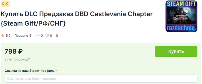 На сайте GGSel нажимаем на поисковую строку и ищем «Dead by Daylight Castlevania Chapter». Находим нужный нам товар. Помимо цены рекомендуем обращать внимание на продажи, отзывы и рейтинг продавца.