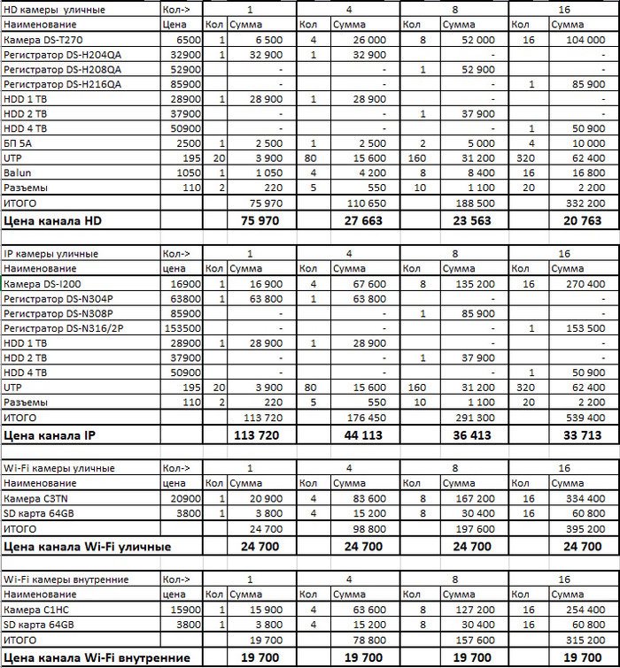 Далее попытаемся сравнить стоимость систем видеонаблюдения в зависимости от типа и количества камер. Wi-Fi камеры будем включать в ближайшую розетку и подключать к существующей сети WiFi.