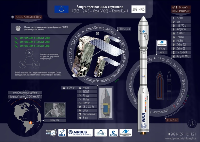 Arianespace запустит три спутника CERES (Capacité de Renseignement Electromagnétique Spatiale или Space Signal Intelligence Capacity) на ракете Vega из Космического центра Гвианы во Французской Гвиане.
