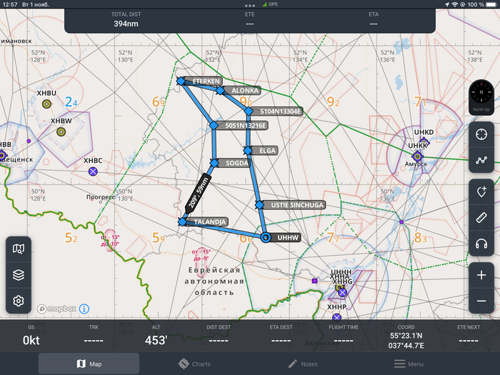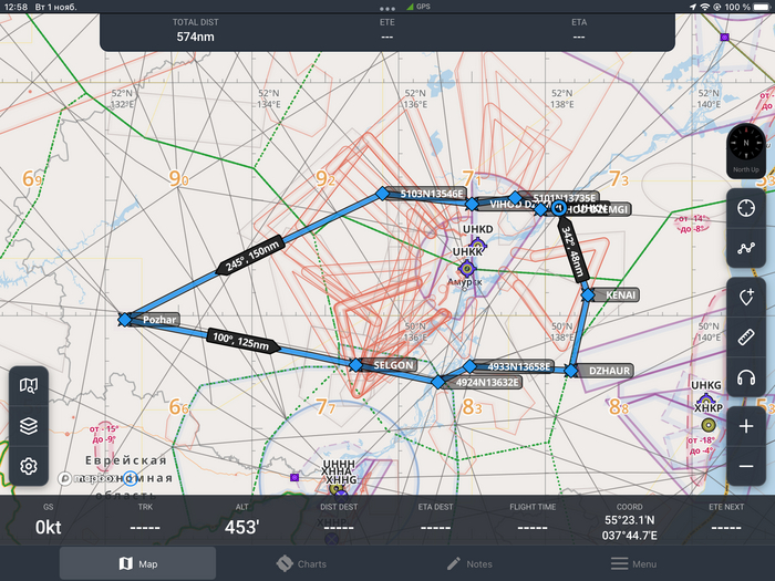 Дополнительный бак у нас был на 400 литров, примерно 10 часов полета, и крыльевые (основные баки) на 200 литров (еще на 5 часов полета). То есть при грубом расчете у нас есть 15 часов при 12ти необходимых. А вот дальше нужно считать точно, потому что океан штука такая, что можно и заблудиться (почитайте историю про путешествие цессны 188 и ее чудесное спасение) и погоду можно обходить выписывая многокилометровые загогулины, но про погоду чуть позже.