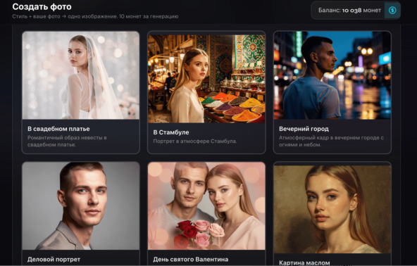 Выберите понравившийся стиль из готовой библиотеки: деловой портрет, романтическая фотосессия, природа, студийная съёмка, фэнтези и многое другое. Нажмите «Создать» — и через несколько минут ваша AI фотосессия готова!